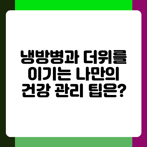 냉방병과 더위를 이기는 나만의 건강 관리 팁은 바로 적절한 온도와 습도를 유지하는 것입니다. 에어컨을 사용할 때는 실내 온도를 26~28도 정도로 유지하고, 너무 차가운 바람이 직접 몸에 닿지 않도록 주의해야 합니다. 그리고 실내 습도를 적절히 조절하고, 자주 환기를 시켜주는 것도 중요해요. 또한, 충분한 수면을 취하고, 규칙적인 운동을 하는 것도 냉방병 예방과 면역력 강화에 도움이 된다고 합니다. 그리고 스트레스 관리도 매우 중요하다는 사실을 잊지 마세요! 스트레스는 면역력을 떨어뜨리는 주요 원인 중 하나입니다. 여름철 건강을 위해서는 충분한 휴식과 스트레스 관리가 필수라는 사실을 기억하고 꾸준히 실천해보세요.