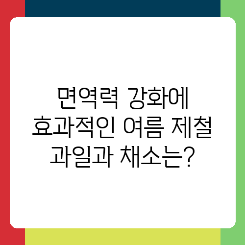 여름철 면역력 강화에는 제철 과일과 채소를 섭취하는 것이 가장 효과적이에요. 수박, 참외, 토마토와 같은 수분이 풍부한 과일은 갈증 해소는 물론이고, 비타민과 미네랄을 공급해 면역력을 높여준다고 합니다. 특히 토마토에 풍부한 라이코펜은 항산화 작용을 하여 면역력 증진에 도움을 준다고 해요. 또한, 여름 채소인 오이, 가지, 애호박 등은 열을 내리고 체내 노폐물 배출을 도와 면역력을 높이는데 효과적이라고 합니다. 저는 개인적으로 가지를 이용한 가지나물 무침을 자주 해 먹는데, 가지의 부드러운 식감과 고소한 맛이 정말 좋더라고요. 이러한 제철 채소를 다양하게 섭취하면 균형 잡힌 영양 섭취가 가능하고, 면역력 증진에도 효과적일 거예요. 다만, 농약 잔류에 주의하여 깨끗하게 씻어서 먹는 것을 잊지 마세요!